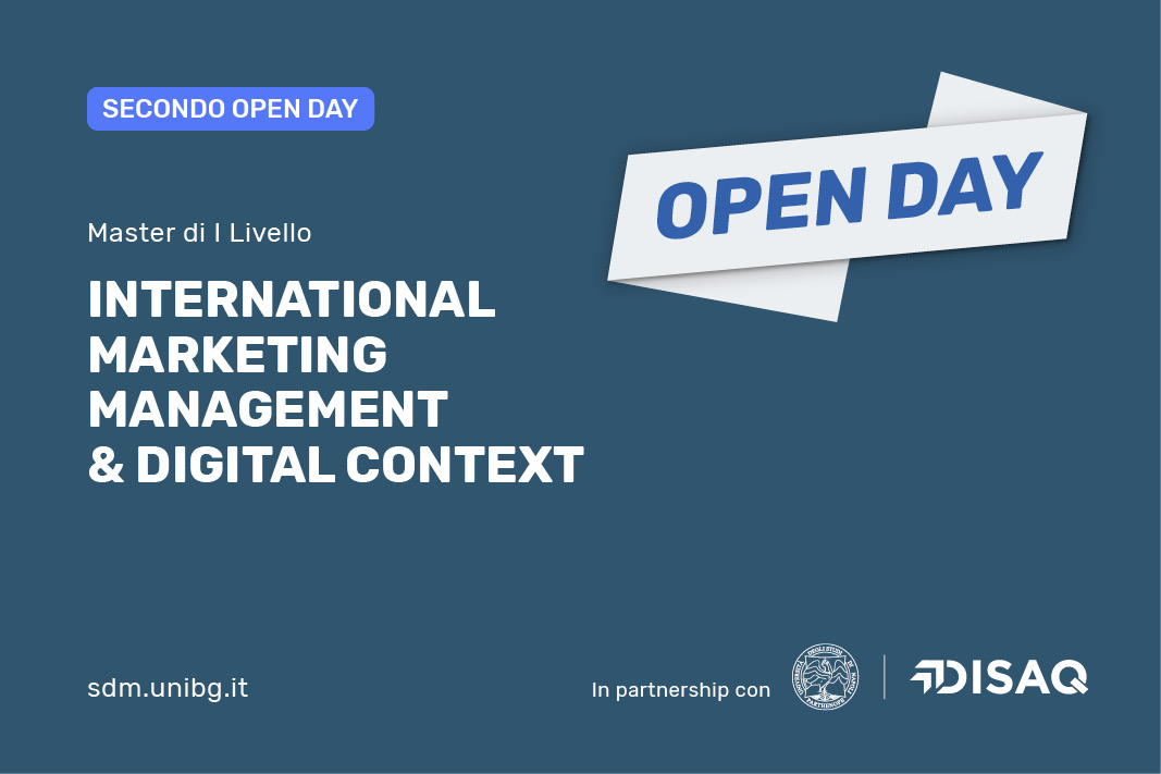 Lunedì 22 settembre 2025, dalle ore 18:30 alle 19:30, presso l’Aula 15 (Bertocchi), sede di Caniana dell’Università degli studi di Bergamo, si terrà il secondo Open Day del Master in ‘International Marketing Management & Digital Context‘ (XXI edizione), promosso da SdM – Scuola di Alta Formazione.